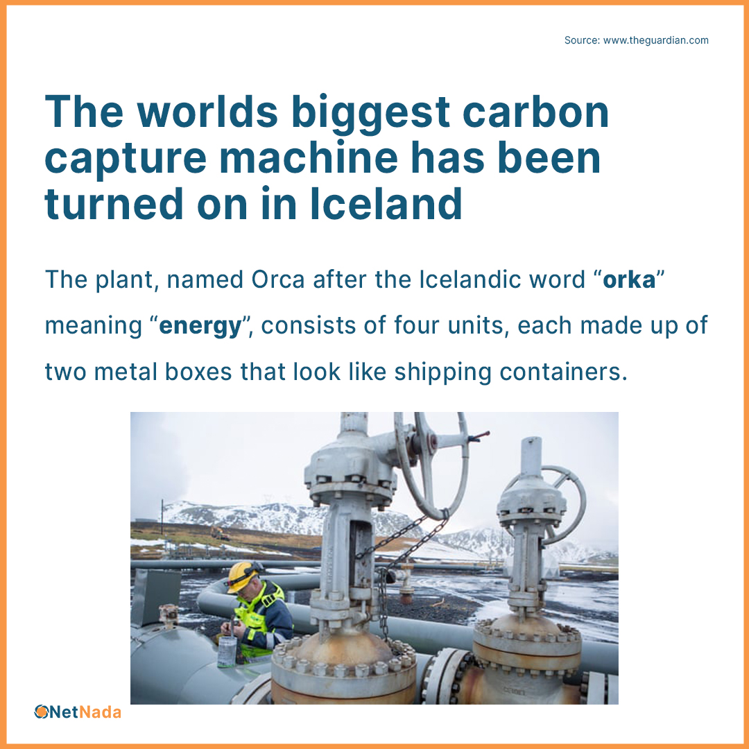 The world’s largest plant designed to suck** carbon dioxide** out of the air and turn it into rock has started running in** Iceland**. The plant consists of units made from metal that looks like shipping containers. The current operating capacity for drawing 4000 tonnes of carbon dioxide out of the air every year, which is emissions from 870 cars.