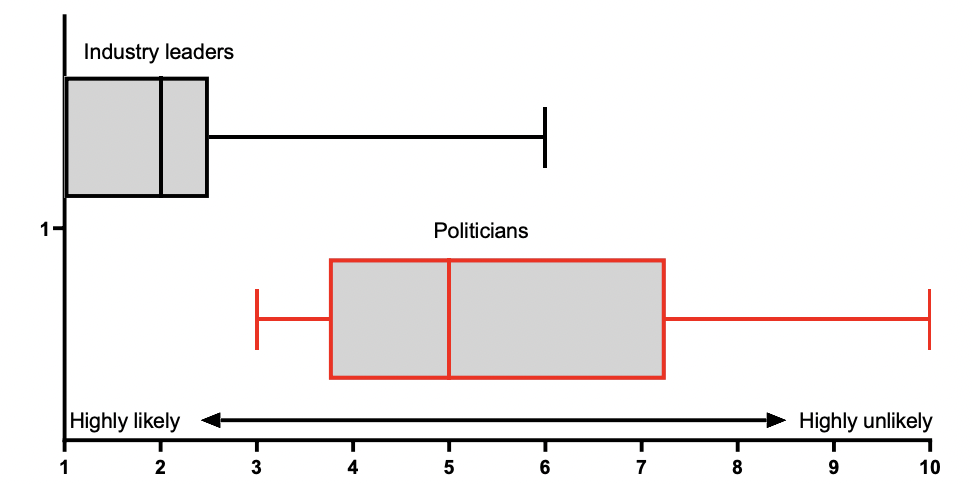 Industry versus politicians ranking (1–10, from highly likely to highly unlikely) of developinga potable reuse project in Sydney in the next 30 years (n = 20).