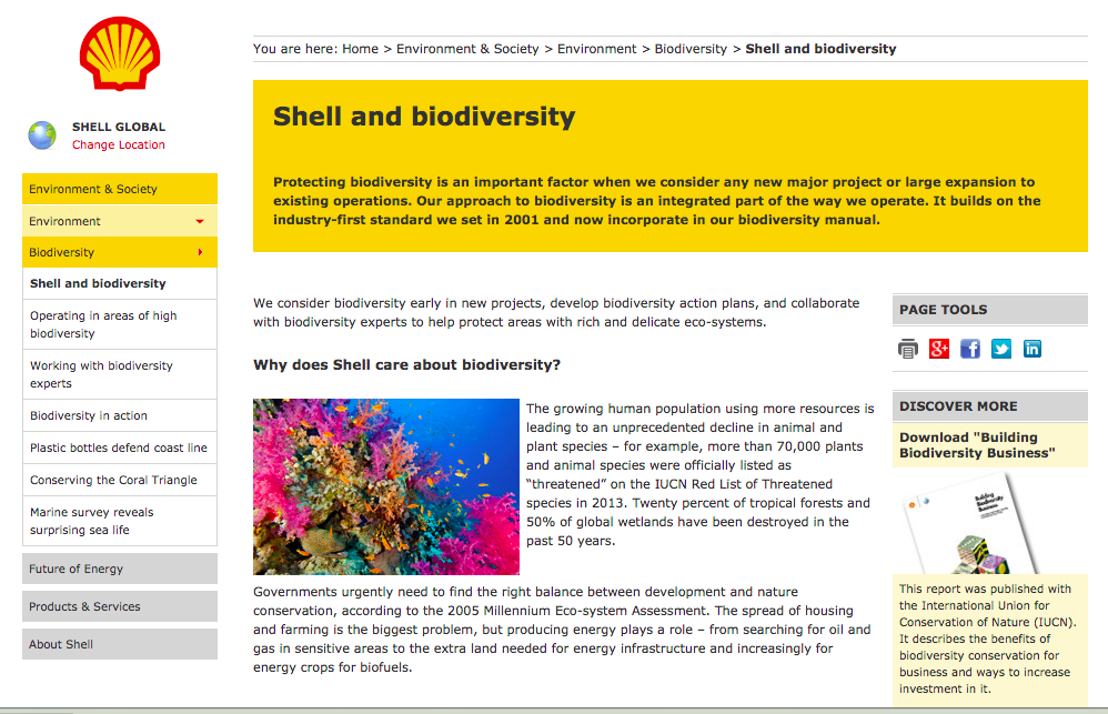 Shell have attempted to cleanse the destructive nature of their work as a giant in the oil and gas industry with a dedicated webpage titled “Sustainability/Biodiversity” that looks more like a brochure for a community centre or a charity.